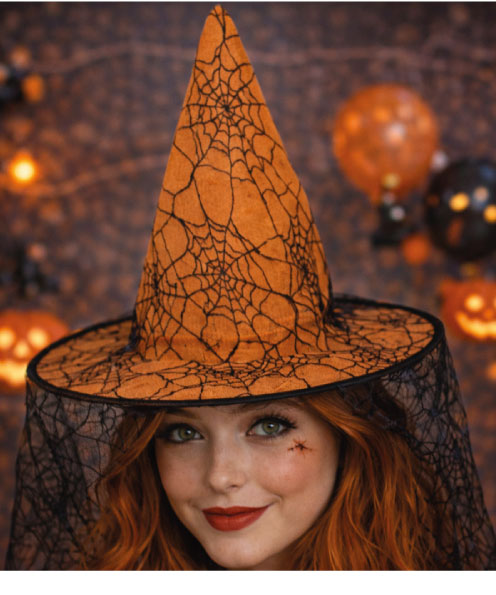• Cadı Şapkası Kadife Tüllü Turuncu Örümcek Baskılı