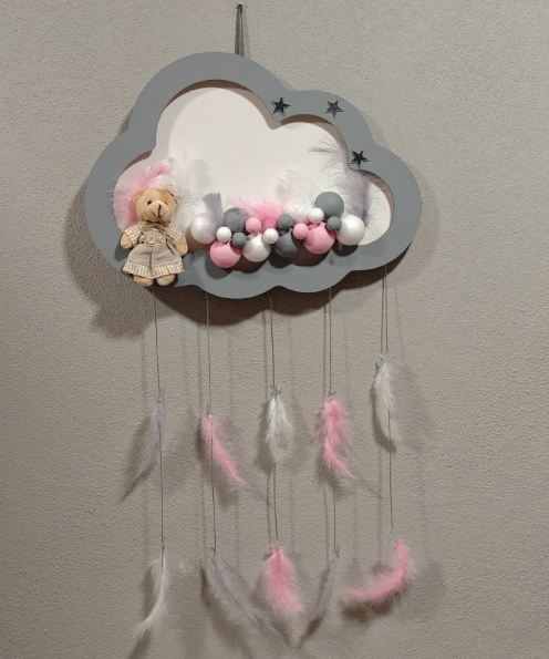 Ahşap Kapı Süsü Işıklı Bulut Model Kız Tema Gri-Pembe
