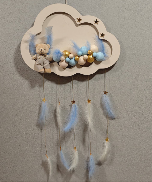 Ahşap Kapı Süsü Işıklı Bulut Model Erkek Tema Krem-Altın-Mavi