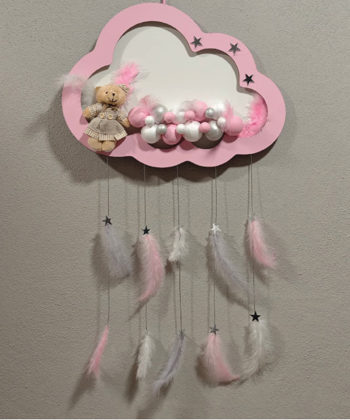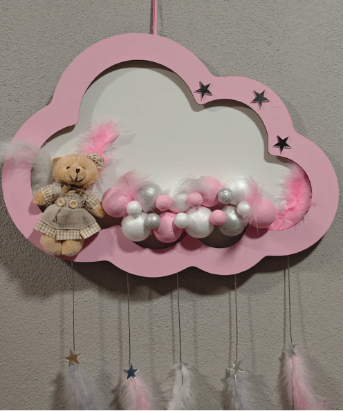 Ahşap Kapı Süsü Işıklı Bulut Model Kız Tema Pembe-Gümüş