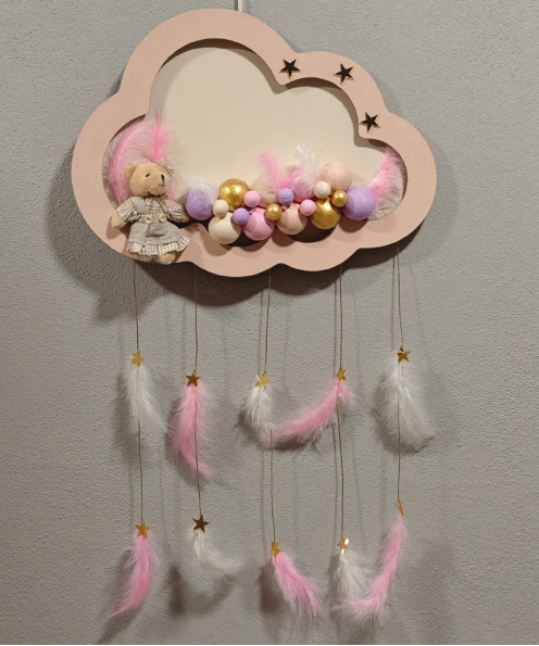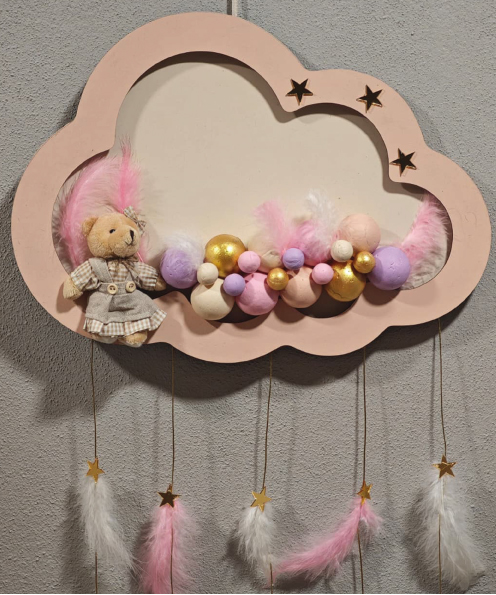 Ahşap Kapı Süsü Işıklı Bulut Model Kız Tema Pembe-Altın