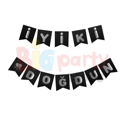 Kağıt banner iyi ki doğdun siyah zemin gümüş varaklı tasarımı ile doğum günü süslemelerinde modern ve dikkat çekici bir dekoratif üründür. Siyah zemin üzerine gümüş varaklı yazı detayı sayesinde masa arkası, duvar ve fotoğraf çekim alanlarında şık ve göz alıcı bir görünüm oluşturur.