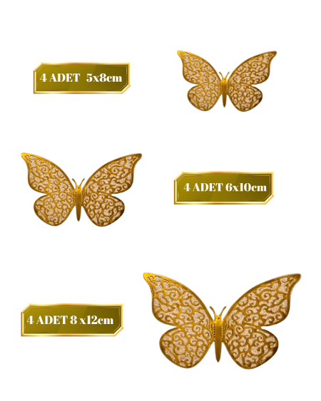 Kağıt Kelebek Dekor Süs 3D Simli Varaklı 12 Parça Altın