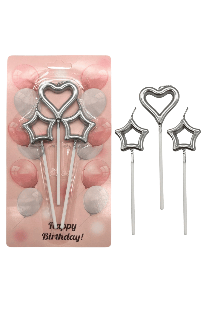 Mum Çubuklu Kalp Yıldız Metalik Gümüş Set 3 Parça