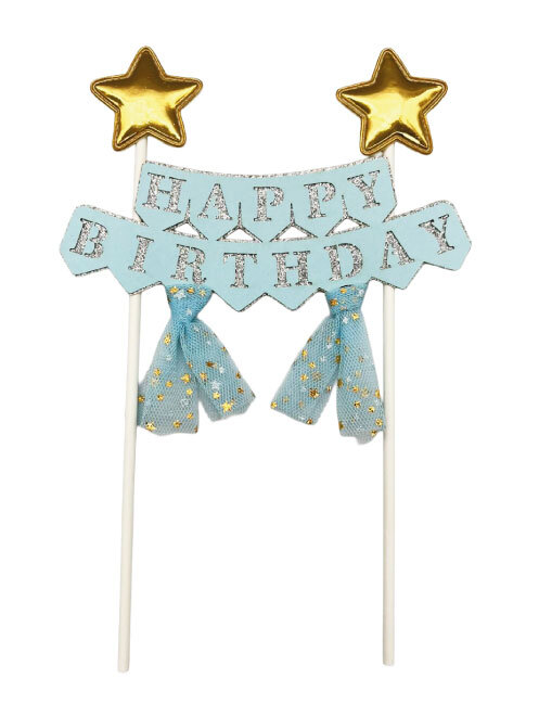 Pasta Üstü Çubuklu Happy Birthday Yıldızlı Tüllü Mavi