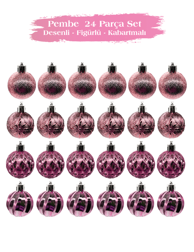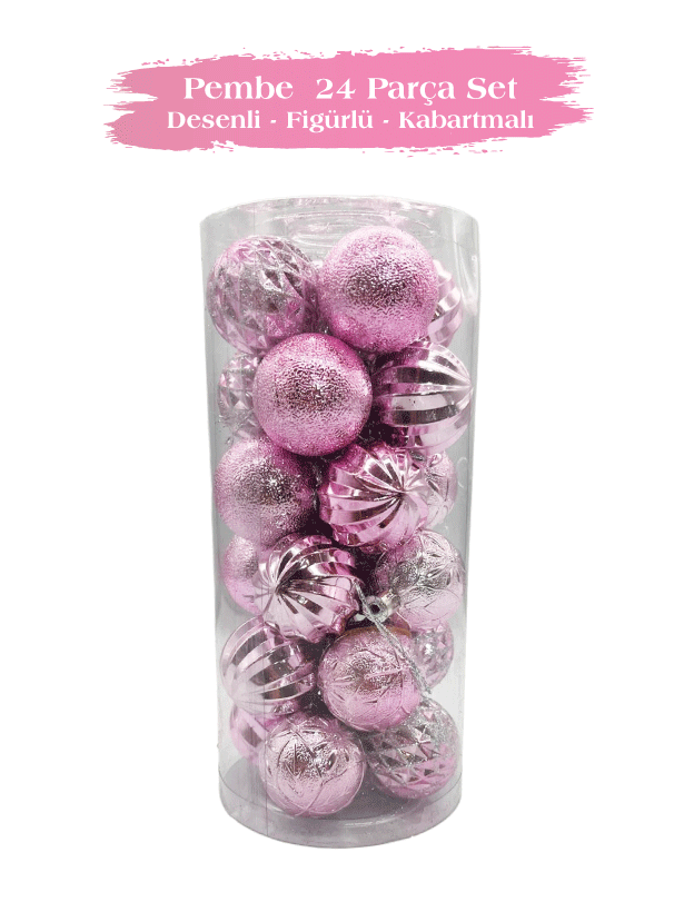 Yılbaşı Top Süs 4 Cm 24 Parça Set Desenli Pembe
