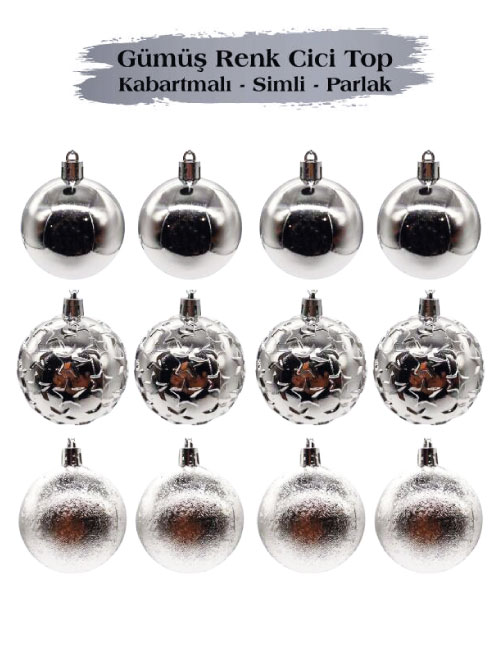YILBAŞI TOP SÜS 6 CM 12 PARÇA PARLAK KABARTMALI GÜMÜŞ