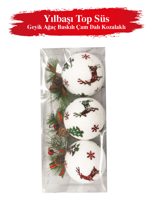 Yılbaşı Top Süs 8 cm Geyik Ağaç Baskılı Çam Dalı Kozalaklı 3 Parça