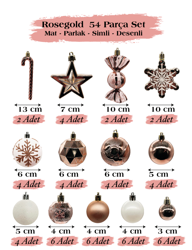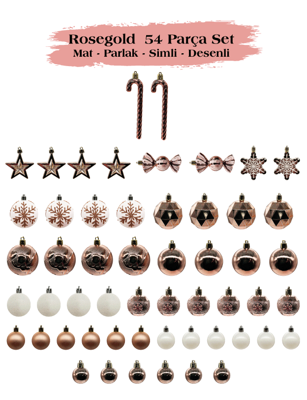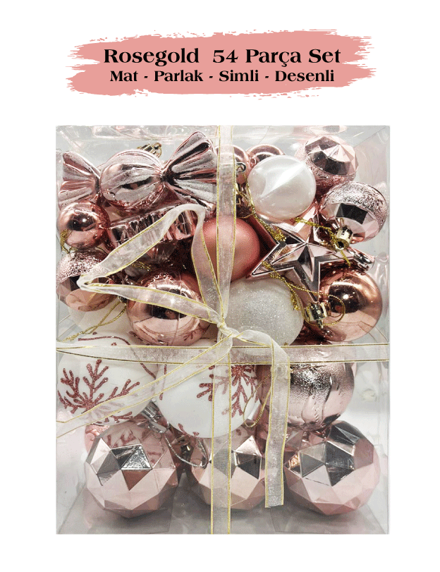 Yılbaşı Top Süs Figürlü Asetatlı 54 Parça Set Rose Gold